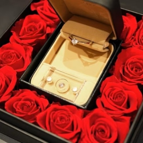国際資格を持つオーナーの確かな審美眼で選び抜いたジュエリーが揃う「ジュエリー土屋」。オリジナルの「選べる!フラワーデコリングケース」と『Will you marry me?』『結婚しよう』のメッセージ付きで、プロポーズを言葉で表現できないシャイな男性もサポート!