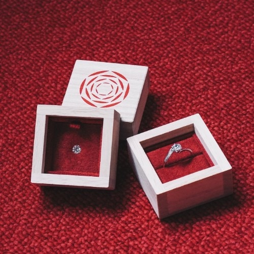 大切な瞬間こそ和の心で臨んでいただけたら。そんな想いを込めて専用の桐箱もご用意。プロポーズ後、おふたりで指輪のデザインをお選びいただき、プロポーズの際に贈られたダイヤモンドをお留めして指輪の作製をいたします。ダイヤモンドは0.25ct~(グレードによって価格が変動します。)で即日お渡しも可能です。